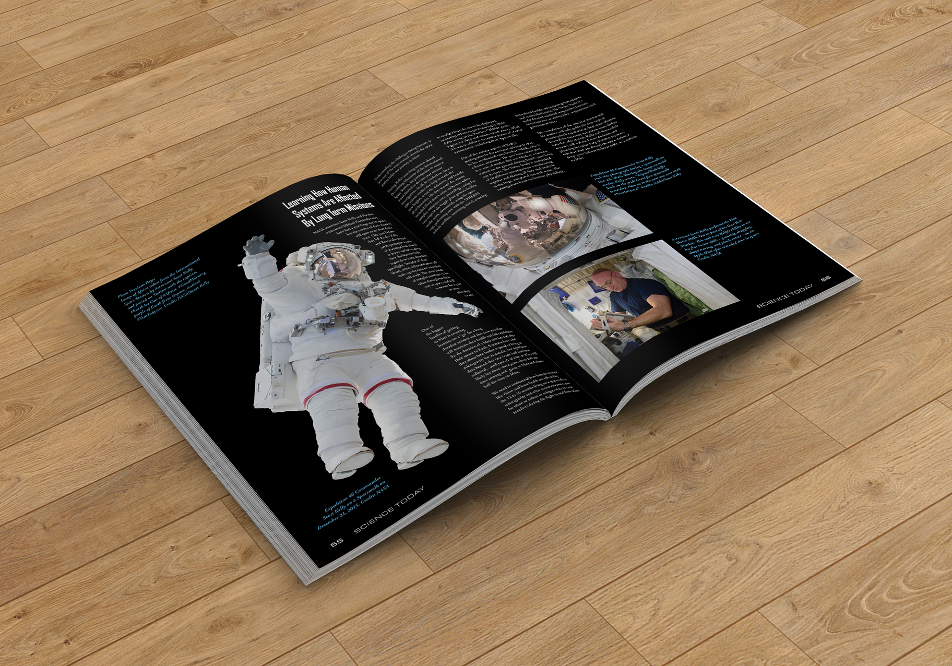 This was a student project that included a cover design, a table of contents, and a four-spread article about Scott Kelly's Year In Space.