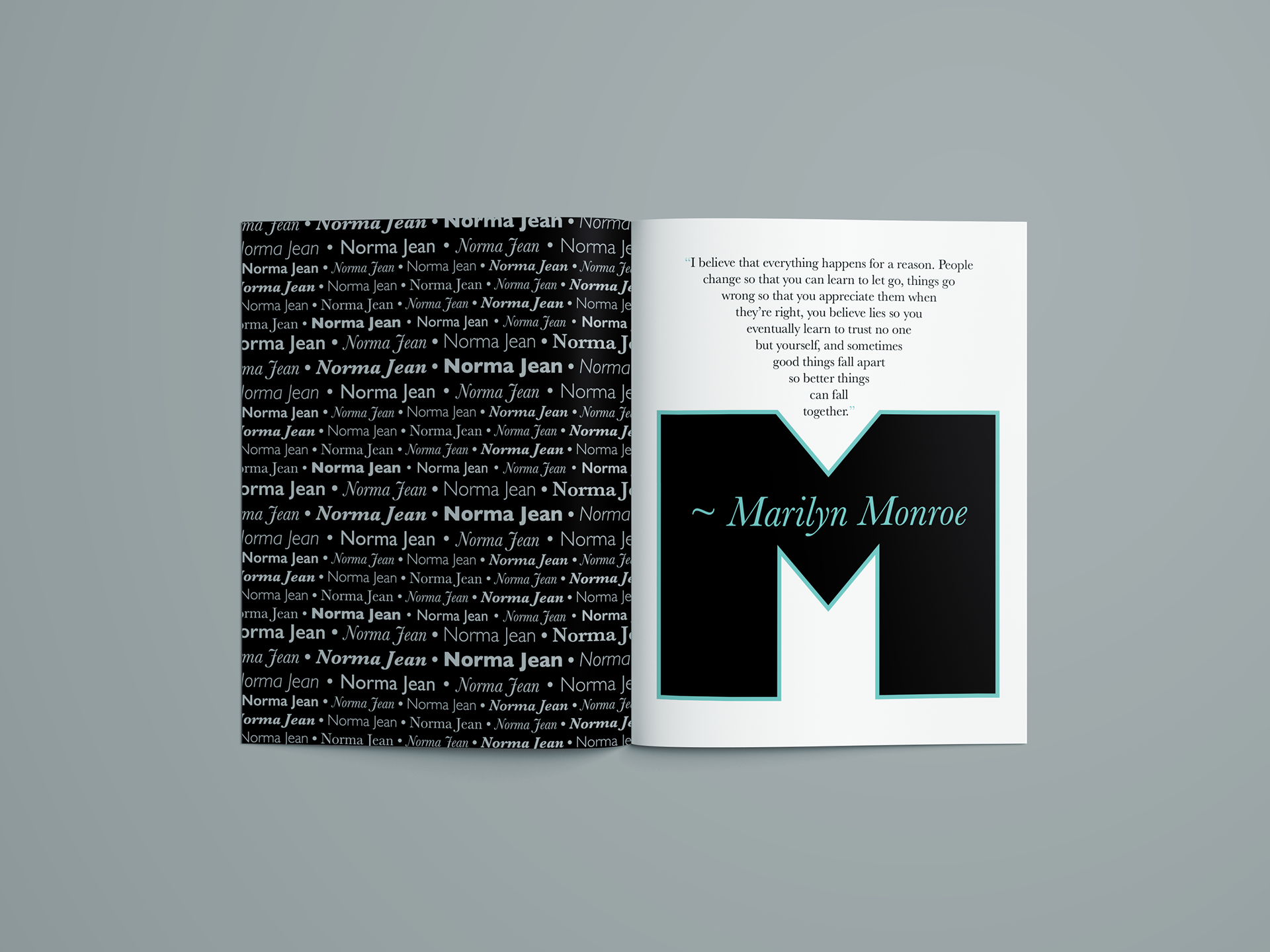 This typography project features two fonts that I really love that work together well. The cover uses characters from both fonts. Each page has a different purpose and layout. I chose to use an image of Marilyn Monroe to go with the letter M, and used the Tiffany blue color because it reminded me of diamonds and Marilyn's Diamonds Are A Girl's Best Friend. The clock image went well with the feel of the Baskerville Q and complements the rest of the book.